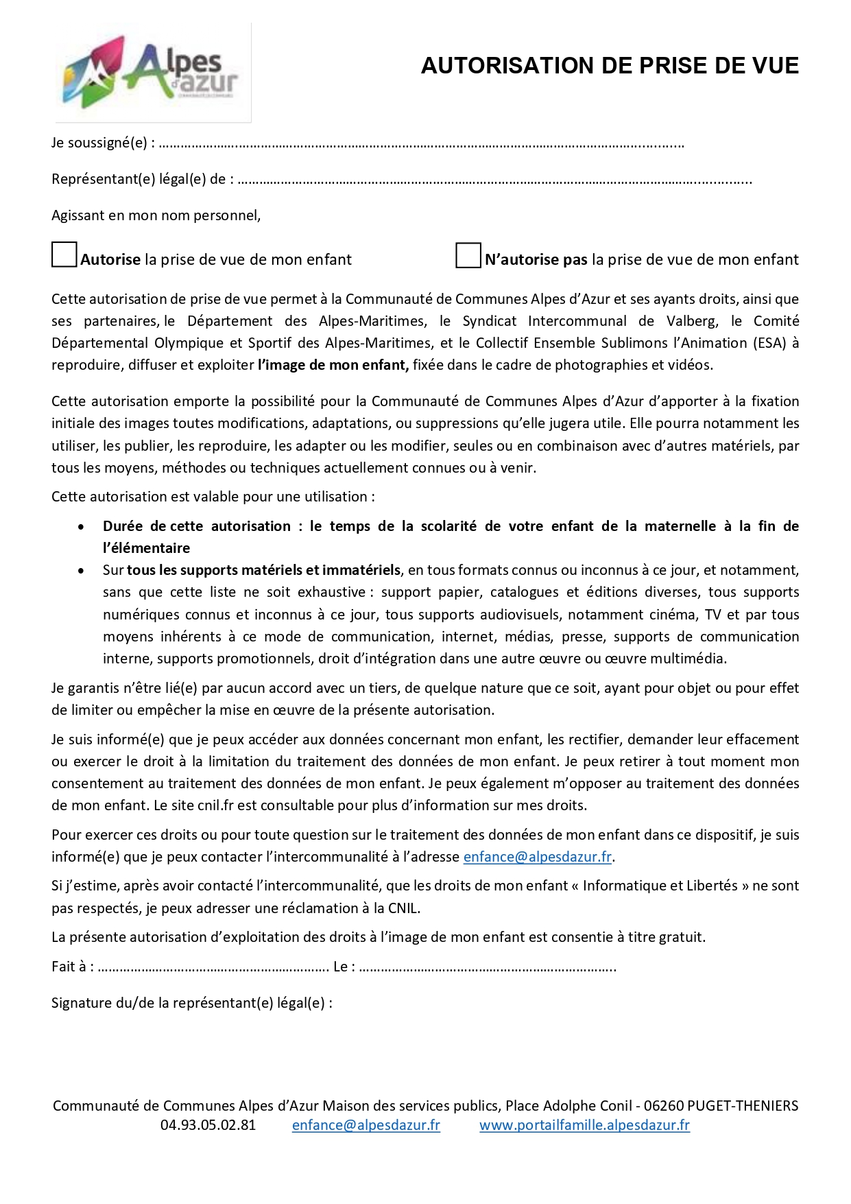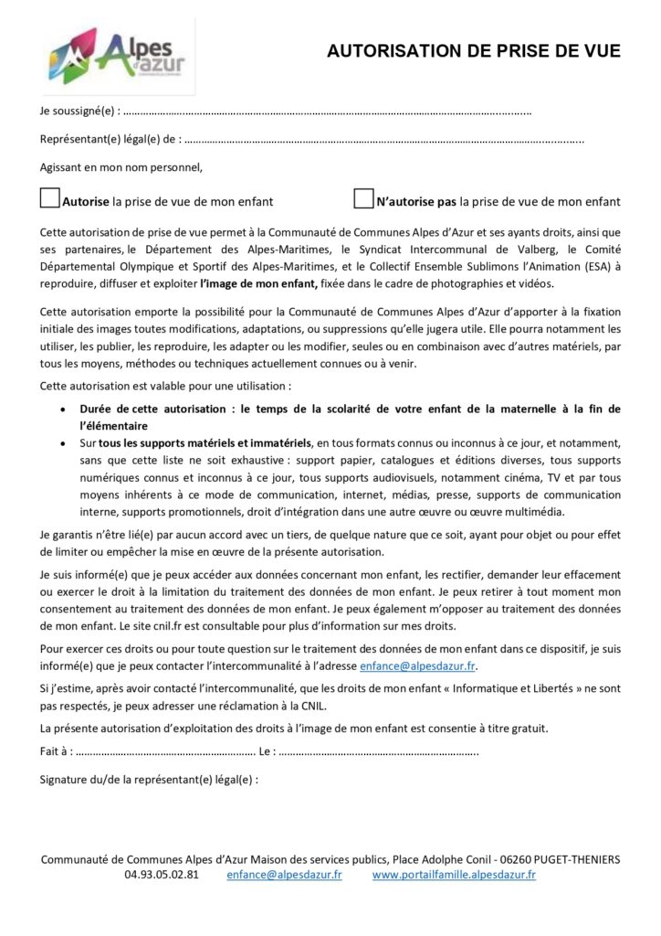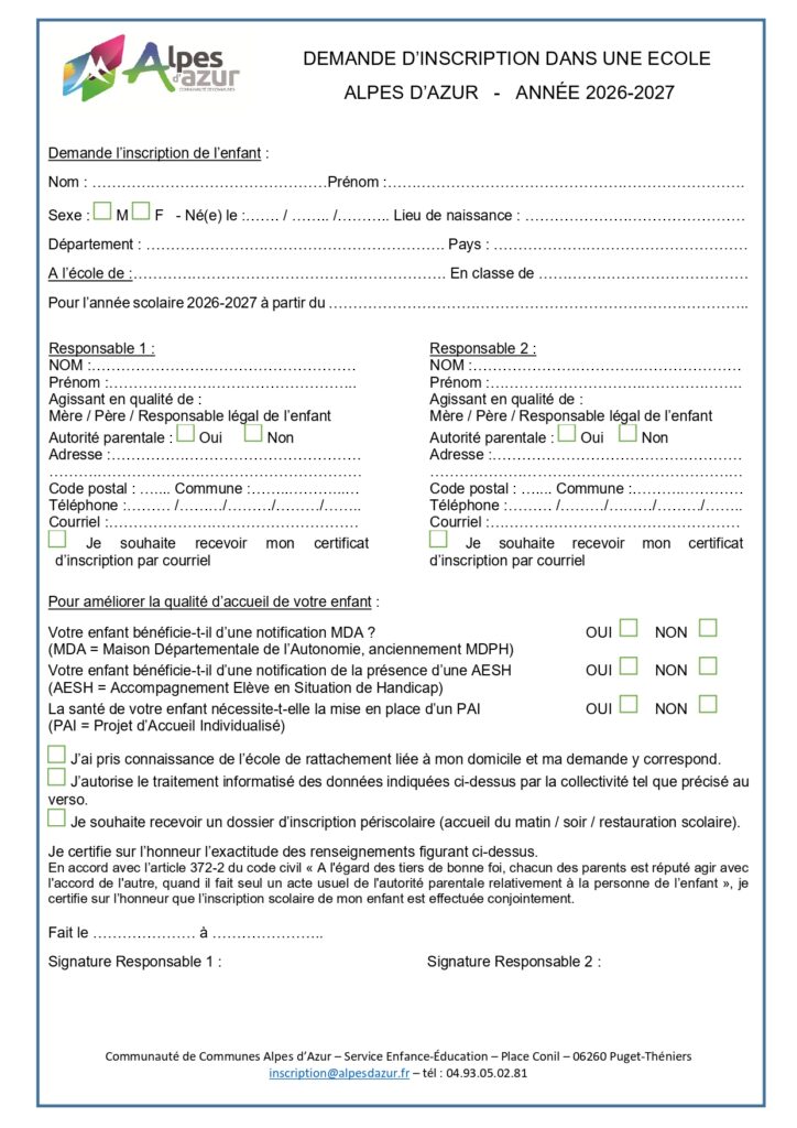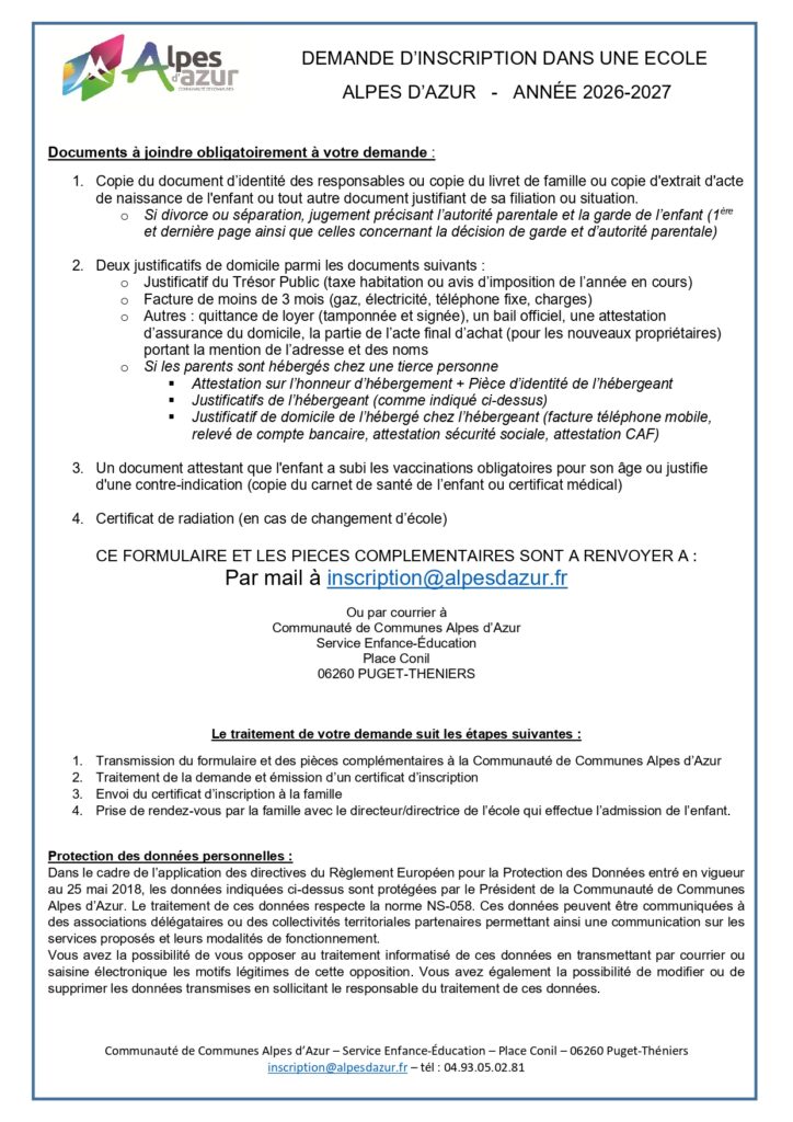 Les familles sont invitées à retourner, un dossier complété pour l’inscription de chaque enfant faisant son entrée à l’école, par mail à l’adresse suivante : inscription@alpesdazur.fr ou par courrier à l’adresse de la Communauté de Communes Alpes d’Azur – Place Conil – 06260 PUGET-THENIERS. Les dossiers peuvent être complétés numériquement sauf pour la signature.