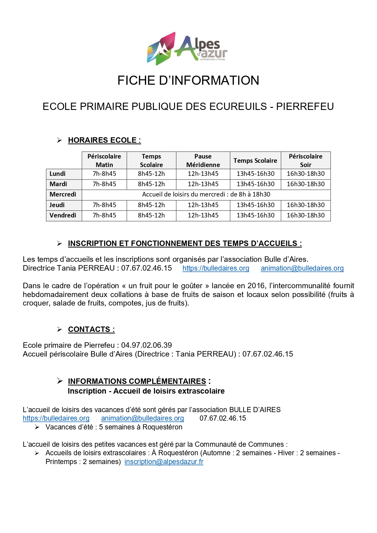 Nous vous invitons à bien lire l’ensemble des documents, à télécharger ceux qui vous seront nécessaires et à les retourner complétés et signés soit par mail à animation@bulledaires.org soit par papier uniquement dans la boîte aux lettres de l’association devant la Maison de Santé Pluridisciplinaire (15, bd Salvago, 06910 Roquestéron).
