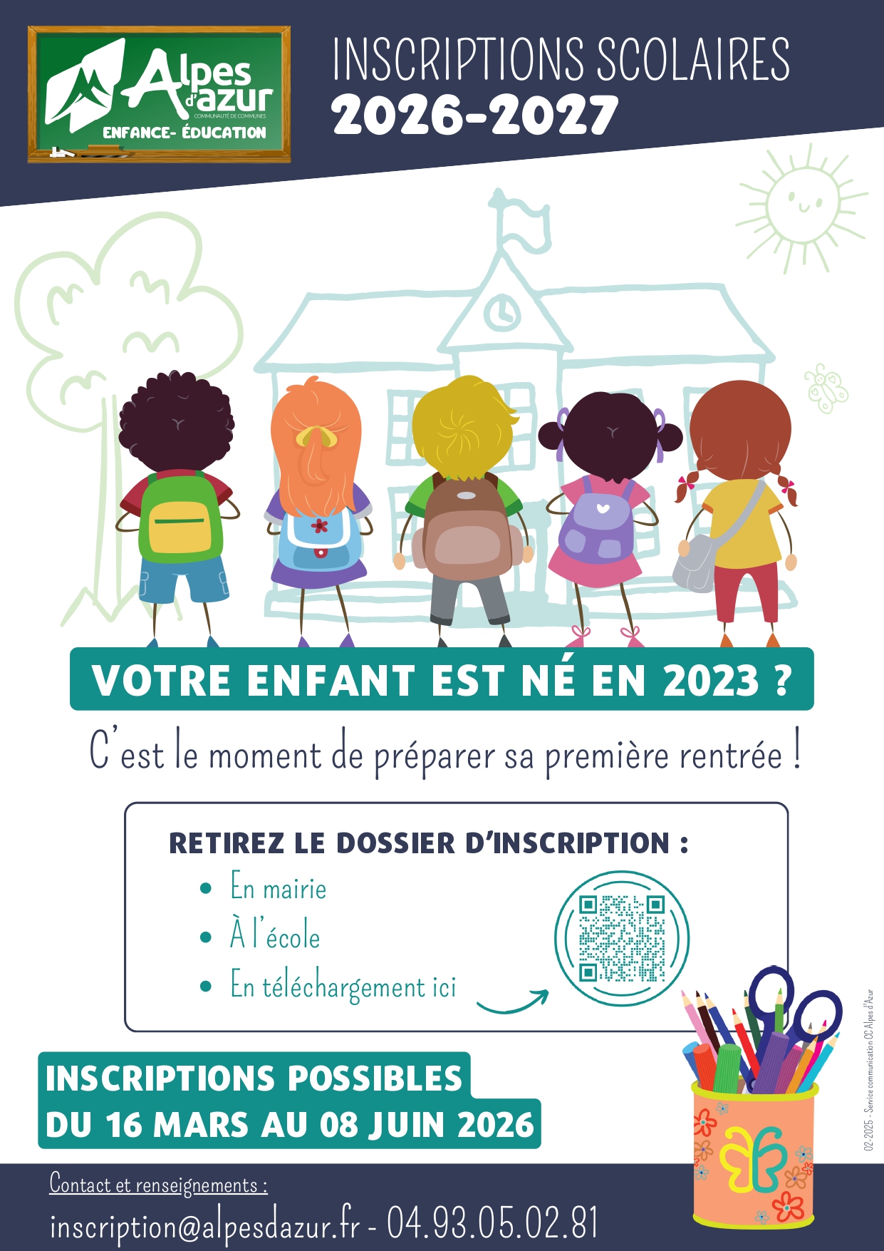Campagne d’inscription scolaire 2026-2027 à compter de ce jour et jusqu’au 8 juin 2026.